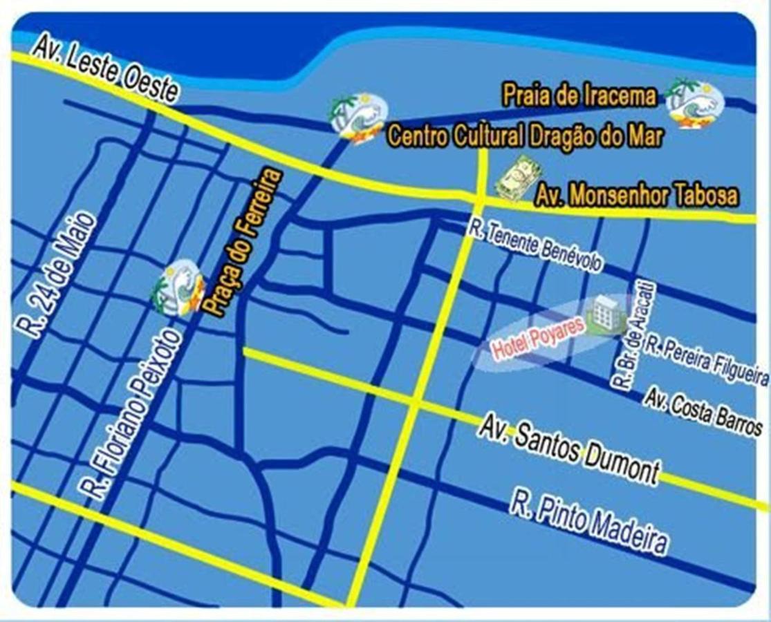 Localizado a apenas 300 m da Praia do Meireles, em Fortaleza, o Poyares oferece piscina com espreguiçadeiras, quartos com ar-condicionado, e sala de TV. A recepção 24 h fornece informações turísticas. O buffet de café da manhã está incluso na diária, e o WiFi está disponível na área da recepção. Os quartos práticos do hotel apresentam uma decoração simples e contam com TV LCD a cabo, telefone e frigobar. Todas as acomodações estão equipadas com banheiro privativo e chuveiro. O Hotel Poyares está situado a somente 1 quarteirão de lojas, bares e restaurantes, e a 3 km do centro de Fortaleza. O Aeroporto Pinto Martins fica a 12 km de distância.